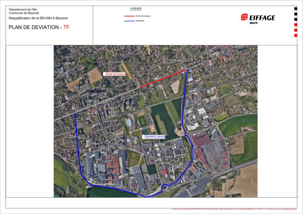 Le plan de circulation proposé par Eiffage pour les déviations lors de travaux de la Tranche ferme de la RD1084 a été validé par la Ville de Beynost en accord avec la Ville de Saint-Maurice-de-Beynost.