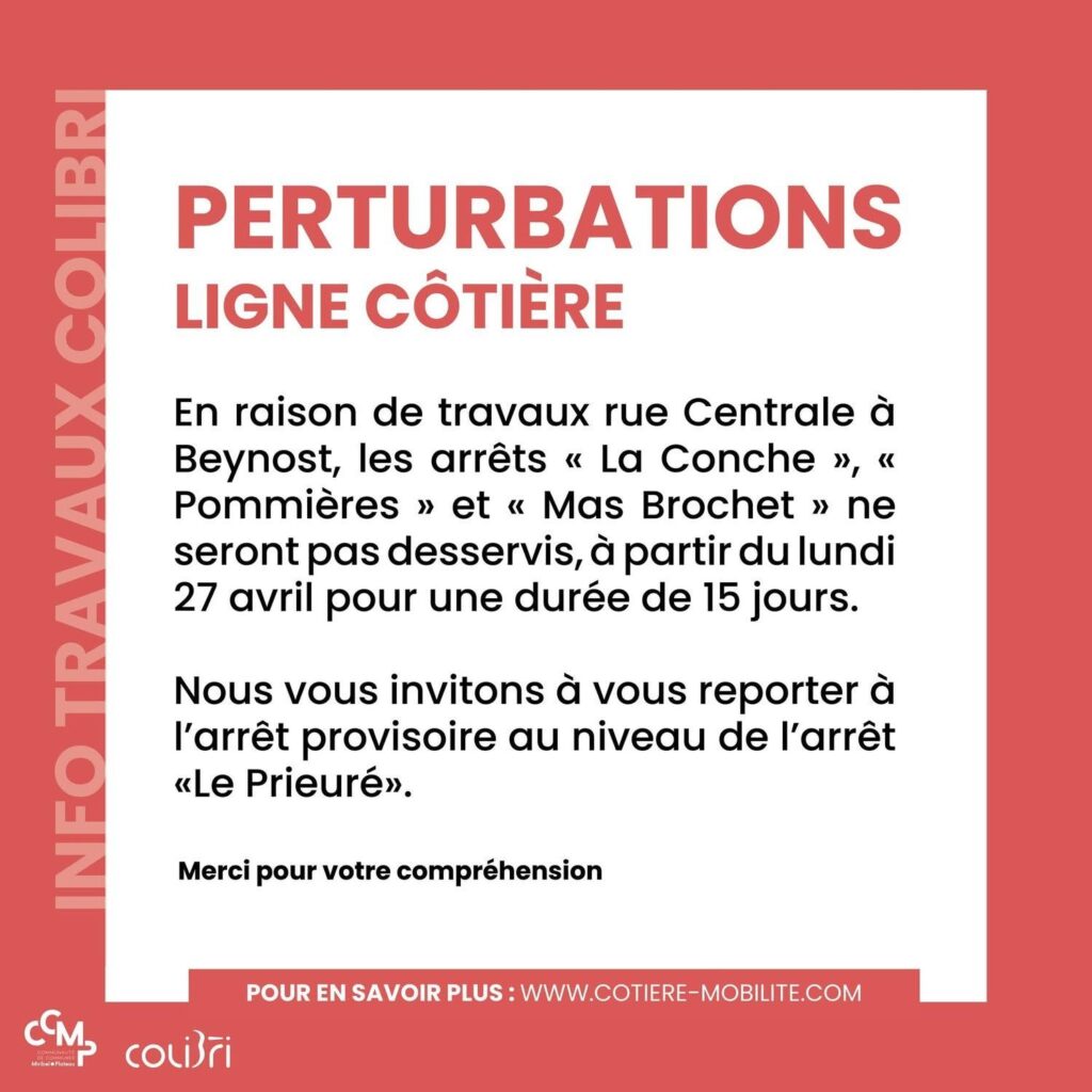 Arrêts COLIBRI : durant cette période les arrêts la Conche, Pommières et Mas Brochet ne pourront être desservis. Un arrêt provisoire au niveau de l’arrêt «Le prieuré» est envisagé.